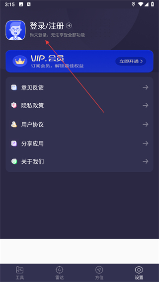 2、在設(shè)置頁面,點(diǎn)擊登錄/注冊選項(xiàng),進(jìn)入登錄界面。