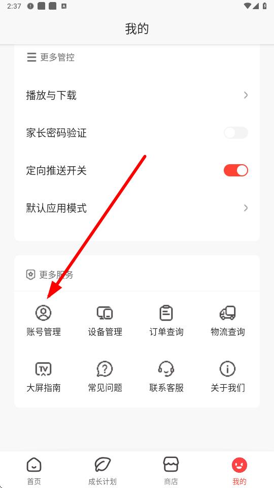 2、在我的頁面,向下滑動,找到賬號管理選項并點擊。