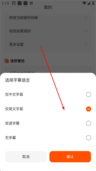 3、選擇僅英文字幕,點擊確認即可去掉中文字幕。