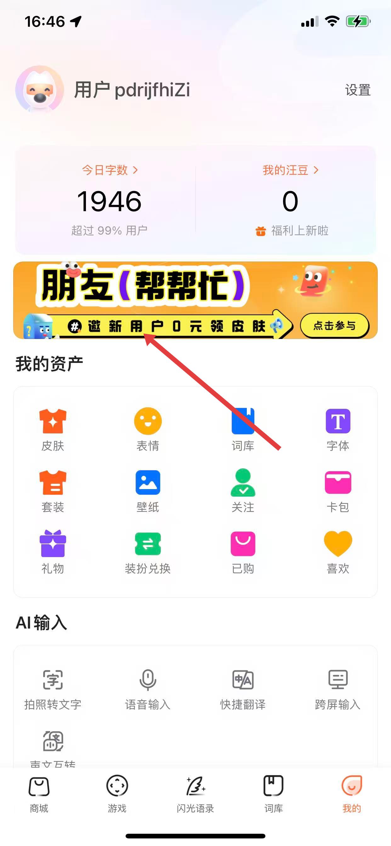 2、在個人中心界面中,找到朋友(幫幫忙)#邀新用戶0元領皮膚活動欄,點擊點擊參與進入活動頁面。