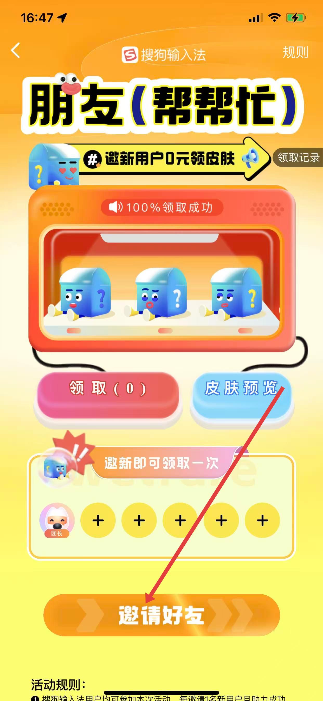 3、在活動頁面中,點擊邀請好友按鈕,將邀請鏈接分享給新用戶,當用戶成功加入后即可獲得免費皮膚。