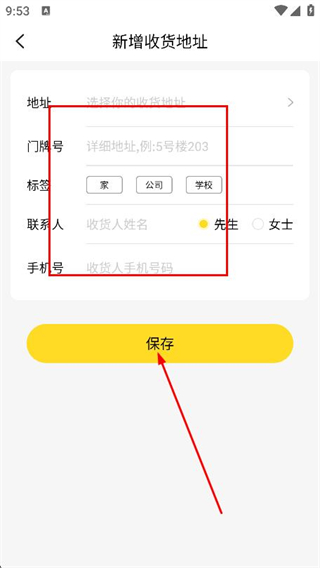 4、填寫信息,點(diǎn)擊保存,即可成功添加收貨地址。