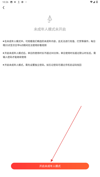 4、在未成年人模式的頁面內(nèi),熟知后點擊開啟的按鈕即可。