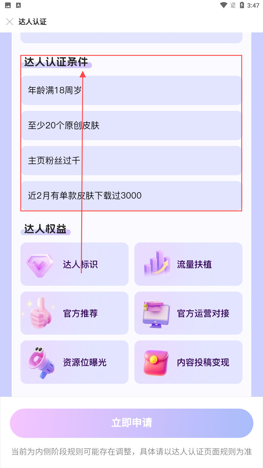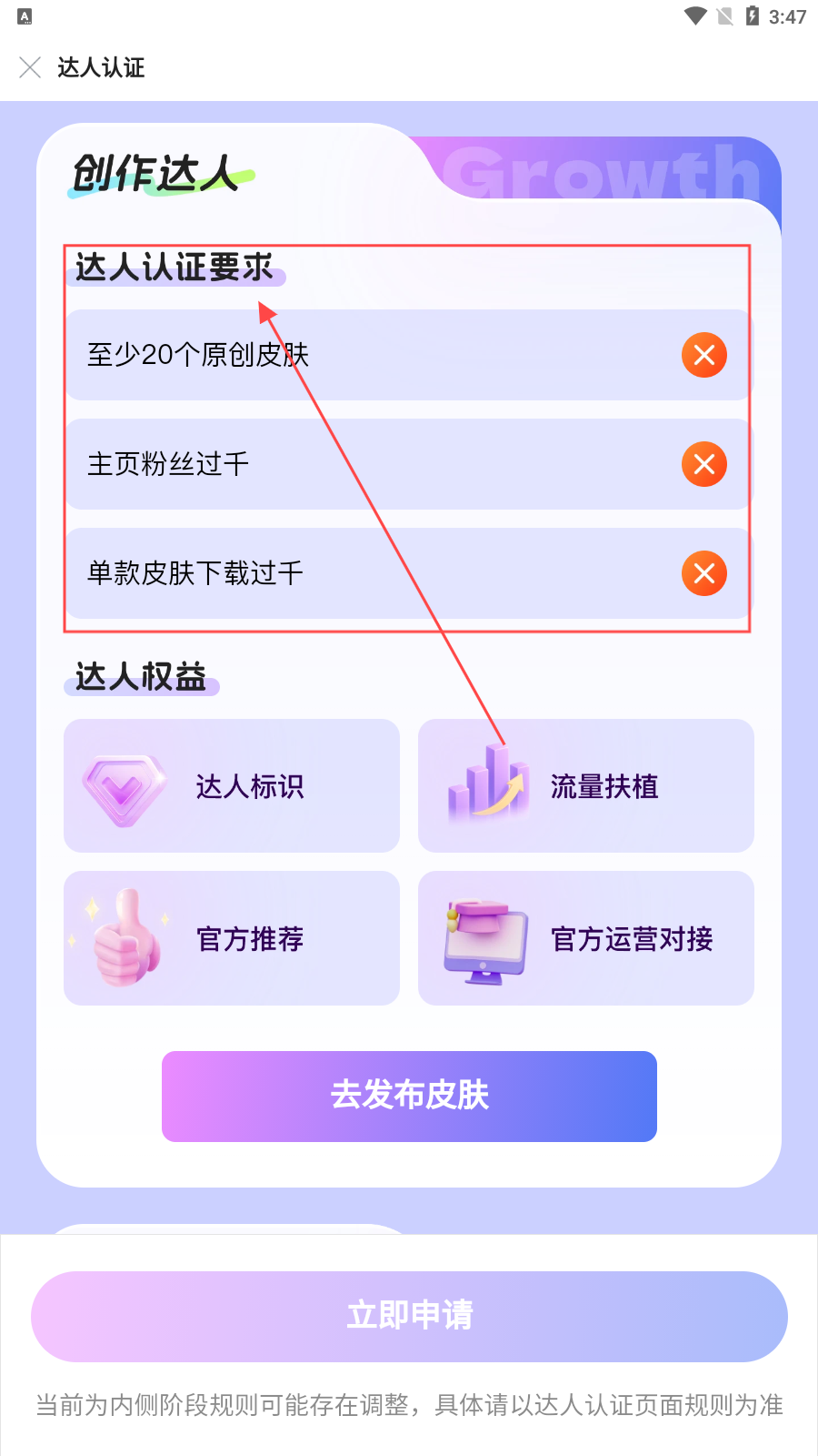 2、仔細查看達人認證要求,目前認證條件包括年齡滿18周歲,至少擁有20個原創(chuàng)皮膚,主頁粉絲數(shù)量超過一千,以及近2個月內(nèi)有單款皮膚下載量超過3000。