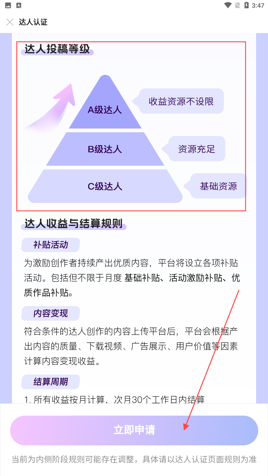 3、確認滿足條件后,點擊達人認證頁面下方的立即申請按鈕,按照系統(tǒng)提示填寫相關(guān)信息并提交申請,提交后等待官方審核,審核通過后即可成為Biu星球達人。