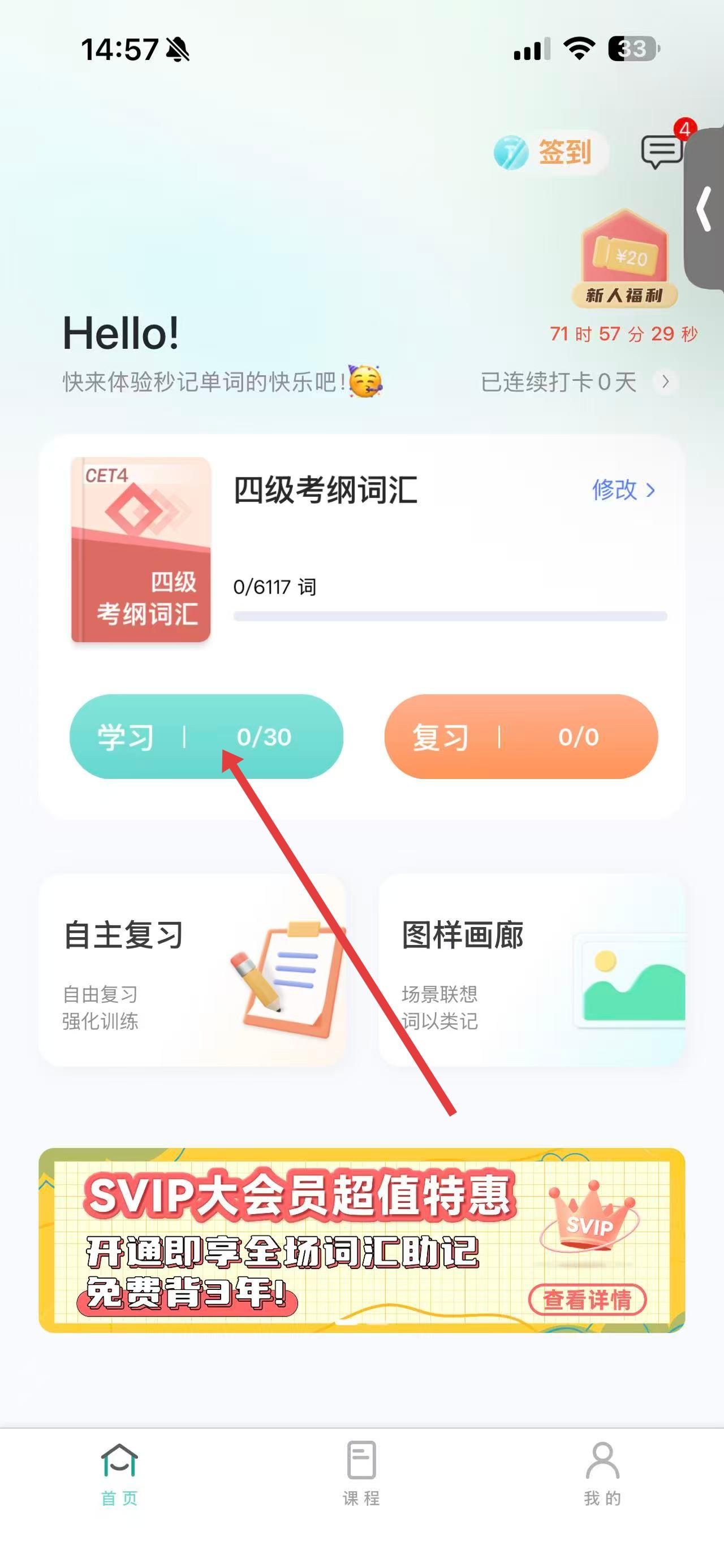 1、打開(kāi)圖樣單詞APP,在首頁(yè)選定四級(jí)考綱詞匯后點(diǎn)擊學(xué)習(xí)按鈕,設(shè)定每日學(xué)習(xí)量開(kāi)始學(xué)習(xí)。