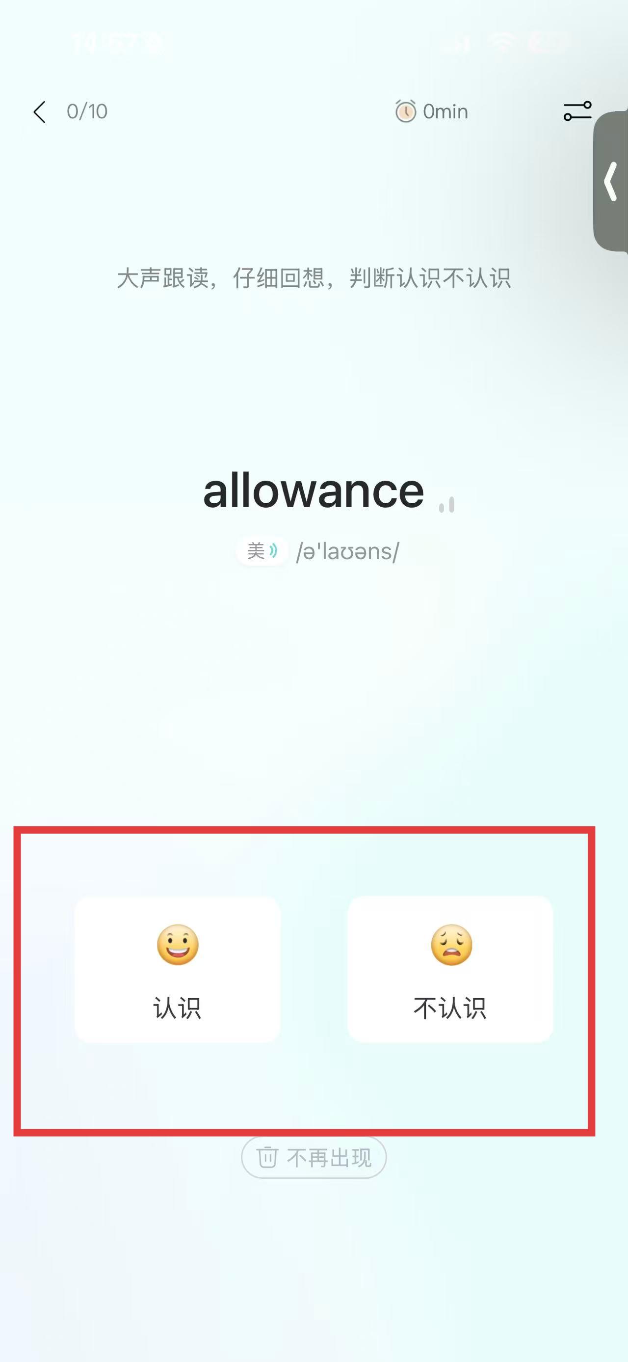 2、進(jìn)入單詞學(xué)習(xí)界面,大聲跟讀單詞allowance后,點(diǎn)擊認(rèn)識(shí)或不認(rèn)識(shí)按鈕反饋掌握情況。