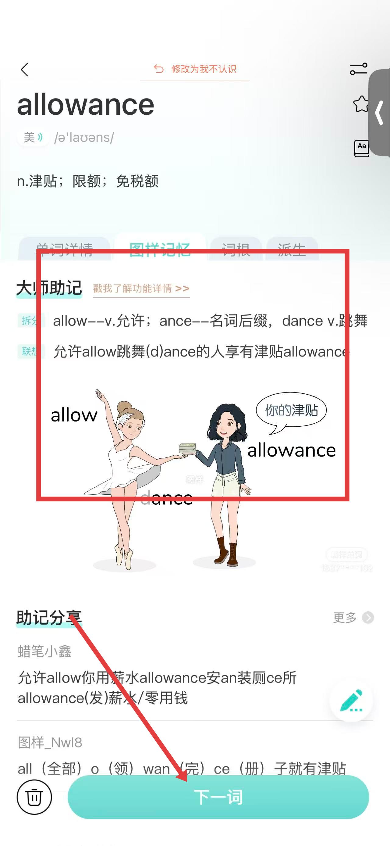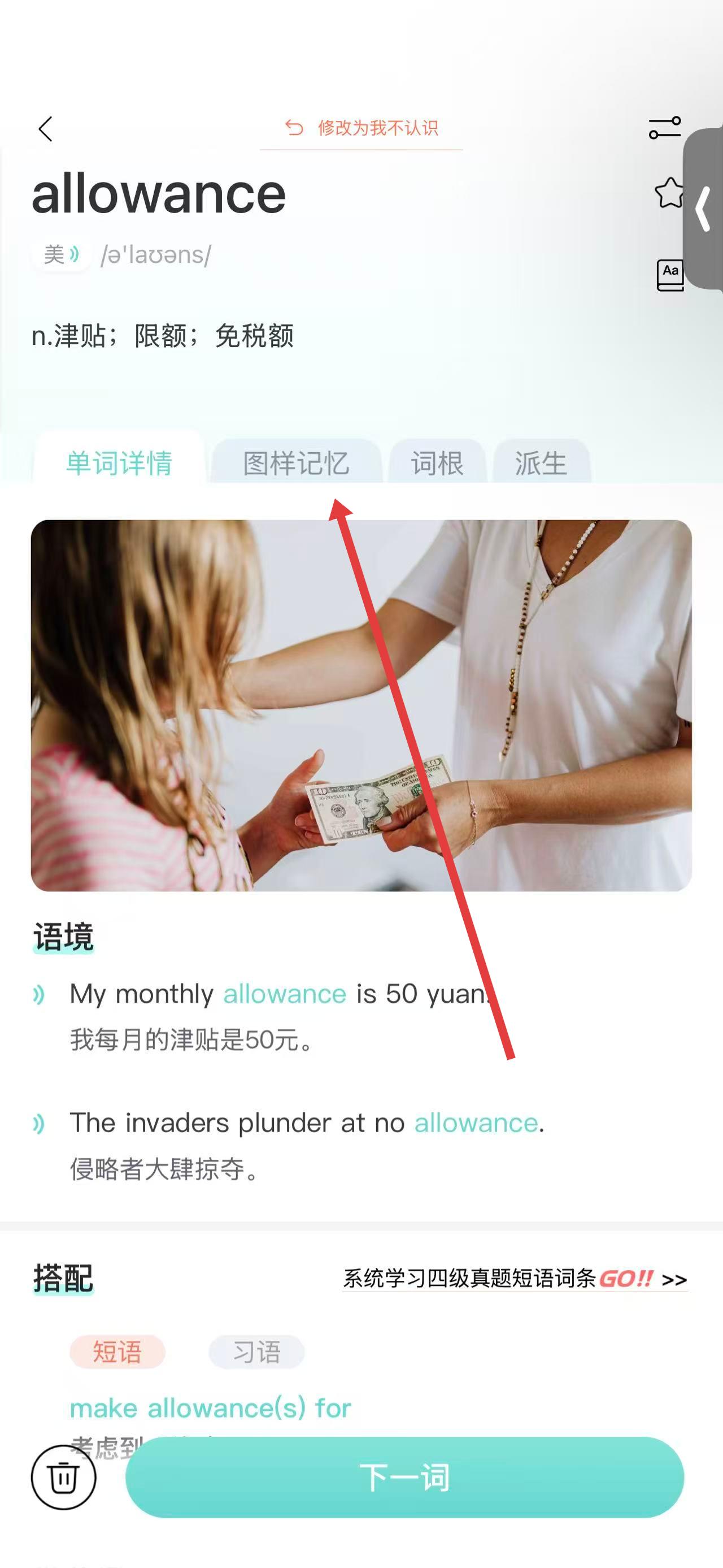 3、在單詞詳情頁(yè),查看單詞allowance的詞義、音標(biāo),還能點(diǎn)擊圖樣記憶標(biāo)簽獲取聯(lián)想記憶方法。