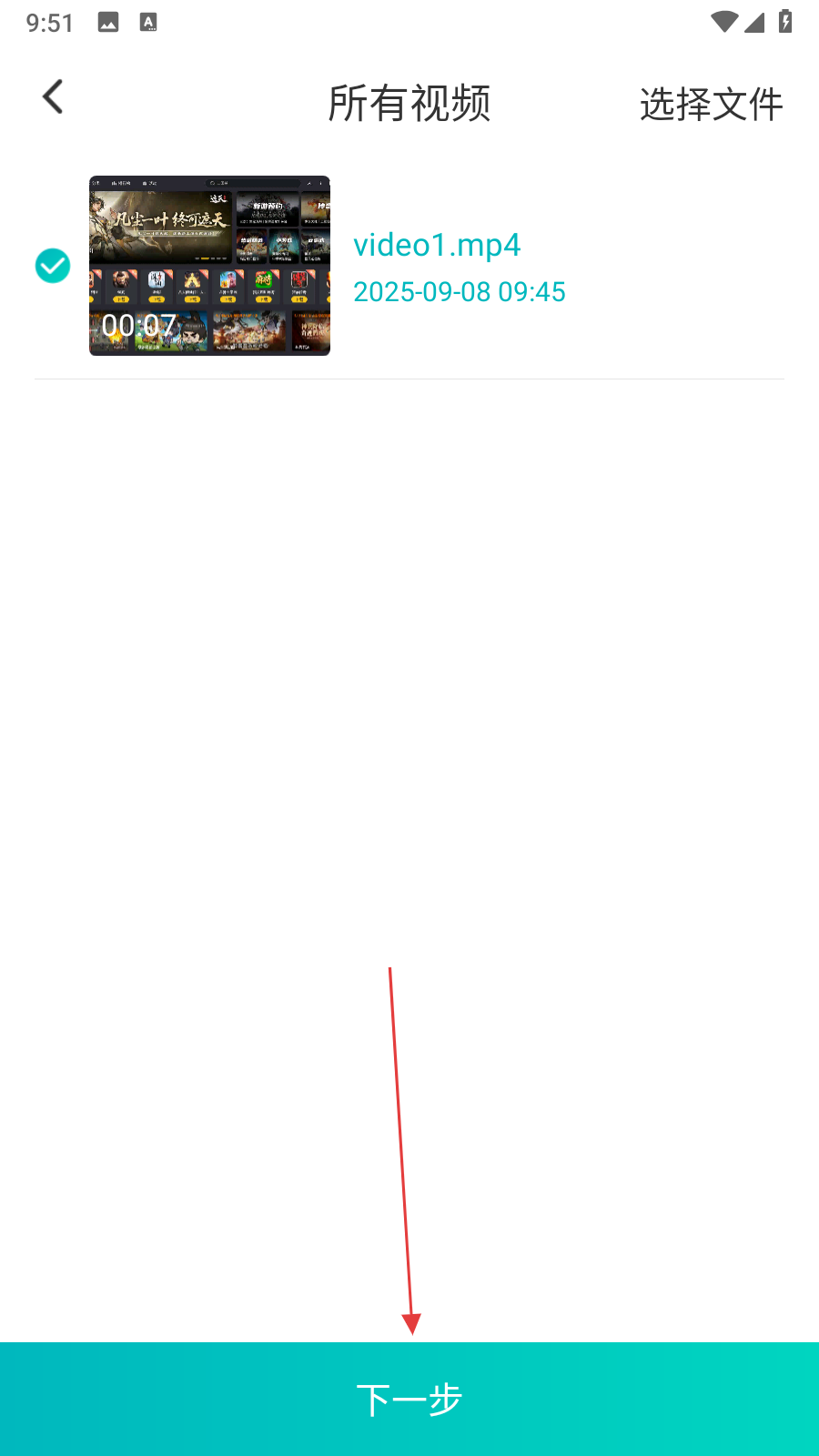 2、在所有視頻列表中勾選需要壓縮的視頻文件,點擊界面底部的下一步按鈕。