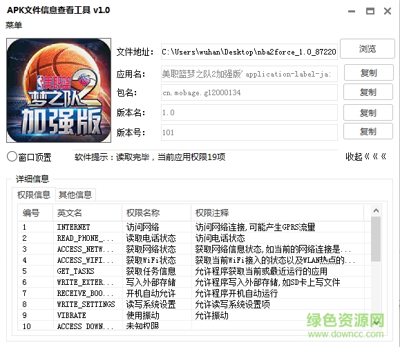 APK文件信息查看工具是一款可以快速查看APK包信息的工具,包括文件地址、應(yīng)用名、包名、版本號、圖片、權(quán)限信息等,讓大家可快速獲取自己需要的內(nèi)容,綠色資源網(wǎng)誠意推薦!
