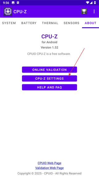 2、在ABOUT頁面中,找到CPU-Z SETTINGS按鈕,點(diǎn)擊該按鈕,進(jìn)入包含溫度單位和功能勾選項的設(shè)置界面。