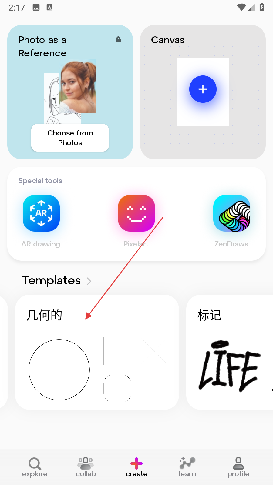 1、打開素描畫圖AR大師應(yīng)用,在create頁面中找到Templates板塊,點擊幾何的模板選項,進入幾何圖形展示頁面。