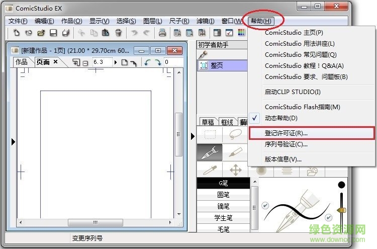 2.打開comic studio軟件,選擇“幫助”下面的“登記許可證”(如圖)