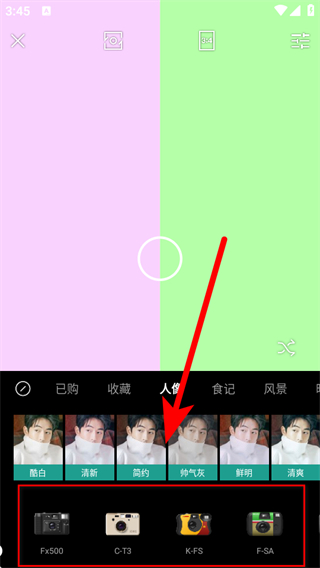 3、在效果頁面,選擇喜歡的相機效果,如人像風(fēng)格或相機型號等。