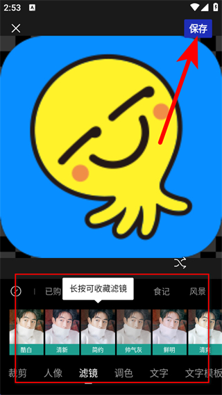 4、在圖片編輯界面中,可使用裁剪、人像、濾鏡、調(diào)色、文字、文字模板等功能編輯,還可長按濾鏡收藏,編輯完成后點擊右上角保存。