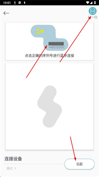 2、進(jìn)入匹配設(shè)備頁面后,可點(diǎn)擊掃一掃掃描設(shè)備上的二維碼,或點(diǎn)擊正確的設(shè)備序列號,點(diǎn)擊匹配進(jìn)行藍(lán)牙連接。
