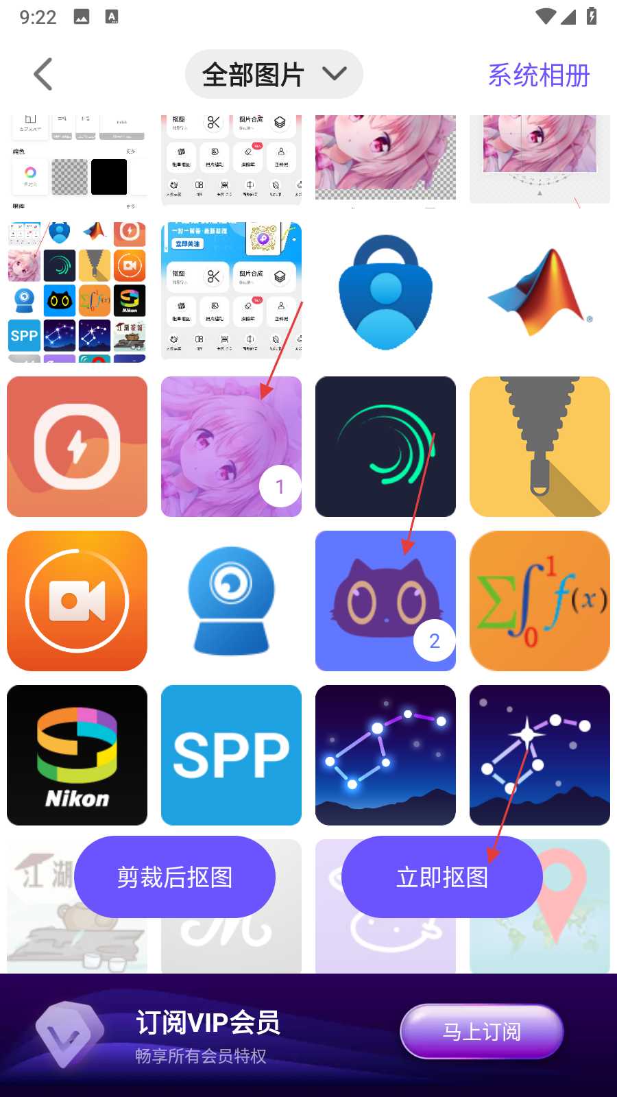 2、在全部圖片或系統(tǒng)相冊中,點(diǎn)擊選擇多張需要批量摳圖的圖片,選擇完成后,點(diǎn)擊底部立即摳圖按鈕。