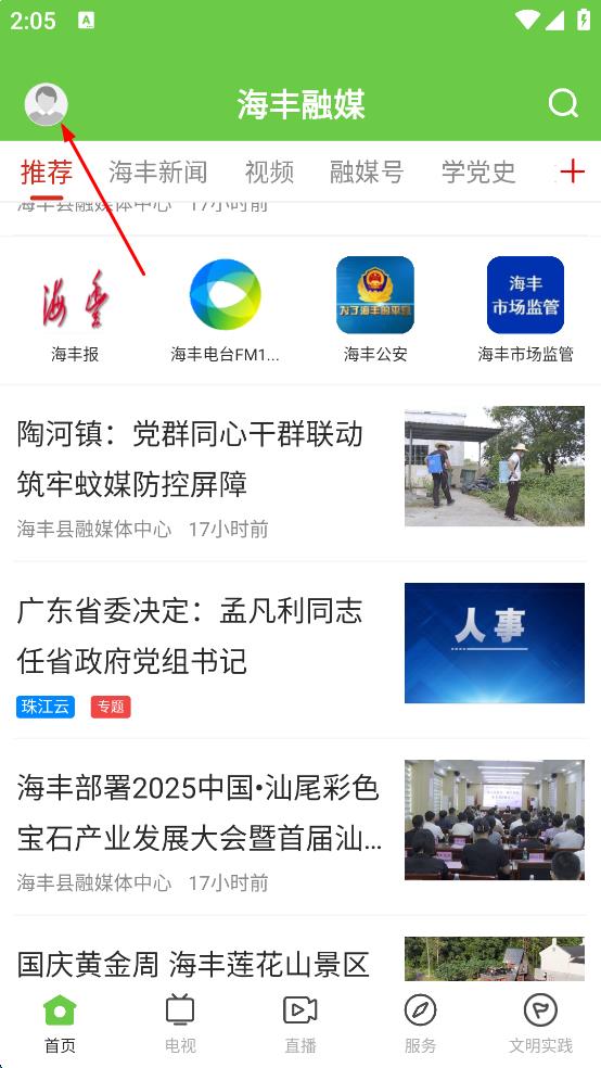 2、進(jìn)入海豐融媒首頁(yè),點(diǎn)擊頁(yè)面左上角的頭像圖標(biāo)。