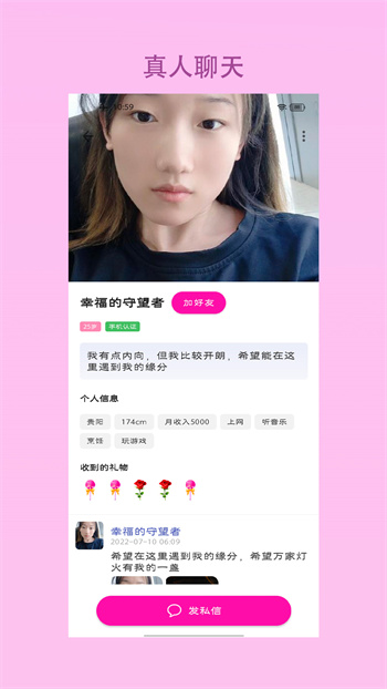 由愛情獨白、基本信息、征友條件、聯(lián)系方式等其他個人信息組成的會員資料,第一時間了解你心中的TA,為你們愛情增加更多的信任。