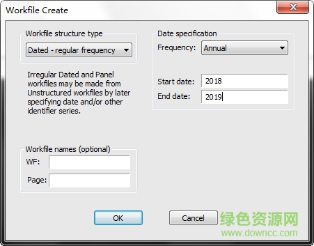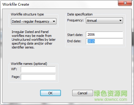 2.開始創(chuàng)建后進(jìn)入到EViews的Wordkfile工作文件設(shè)置界面,我們選擇在 “start date” 處輸入起始時(shí)間,“End date” 處輸入截止時(shí)間。如下: