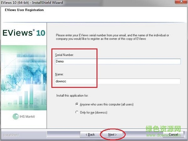6.Serial Number填寫“Demo”,Name任意填寫(比如:downcc),然后點(diǎn)擊“next”