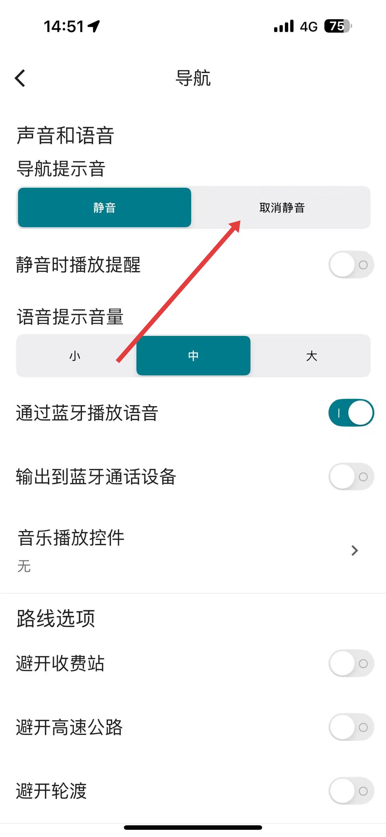 3、在導(dǎo)航設(shè)置界面中的“聲音和語音”板塊,點(diǎn)擊導(dǎo)航提示音中的取消靜音,即可開啟語音播報(bào)。