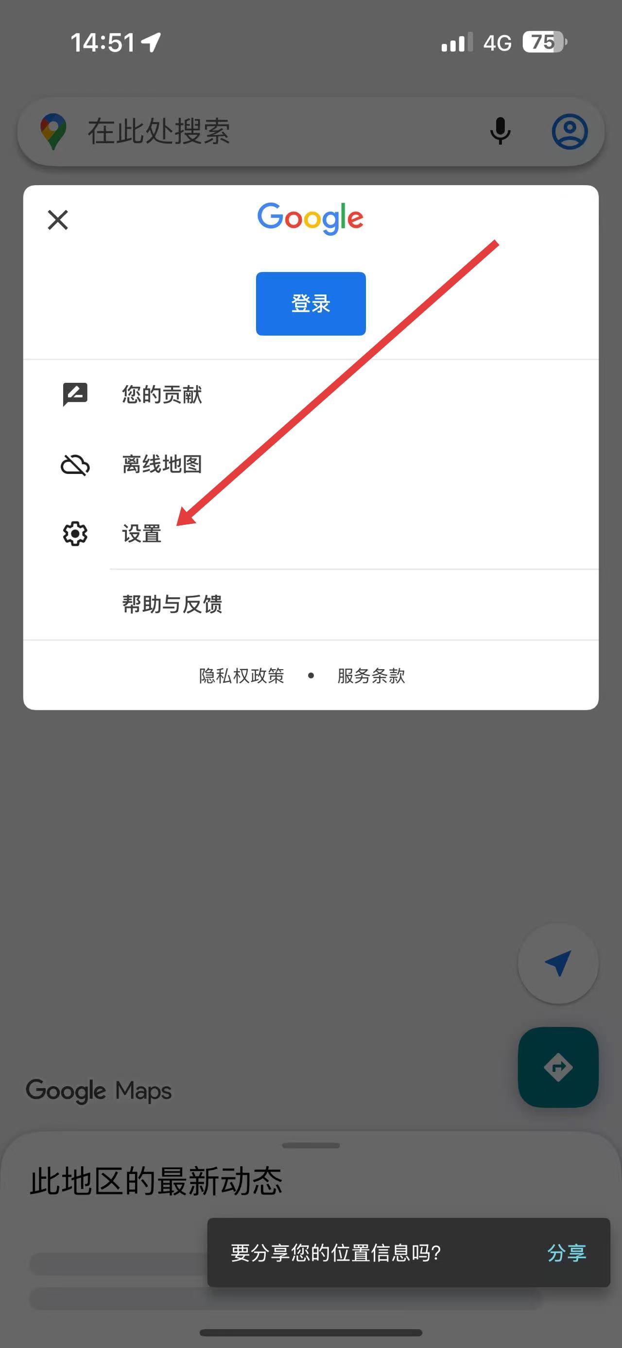 1、打開谷歌地圖應(yīng)用,點(diǎn)擊左上角的搜索框,在彈出菜單中點(diǎn)擊設(shè)置選項(xiàng)。