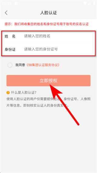 3、在頁面輸入姓名、身份證號,點擊立即授權(quán),完成人臉認證后即可登錄。