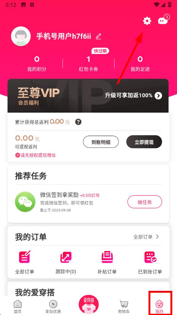 1、打開(kāi)淘粉吧app,點(diǎn)擊底部導(dǎo)航欄中的我的選項(xiàng),在該界面右上角找到設(shè)置圖標(biāo)并點(diǎn)擊。