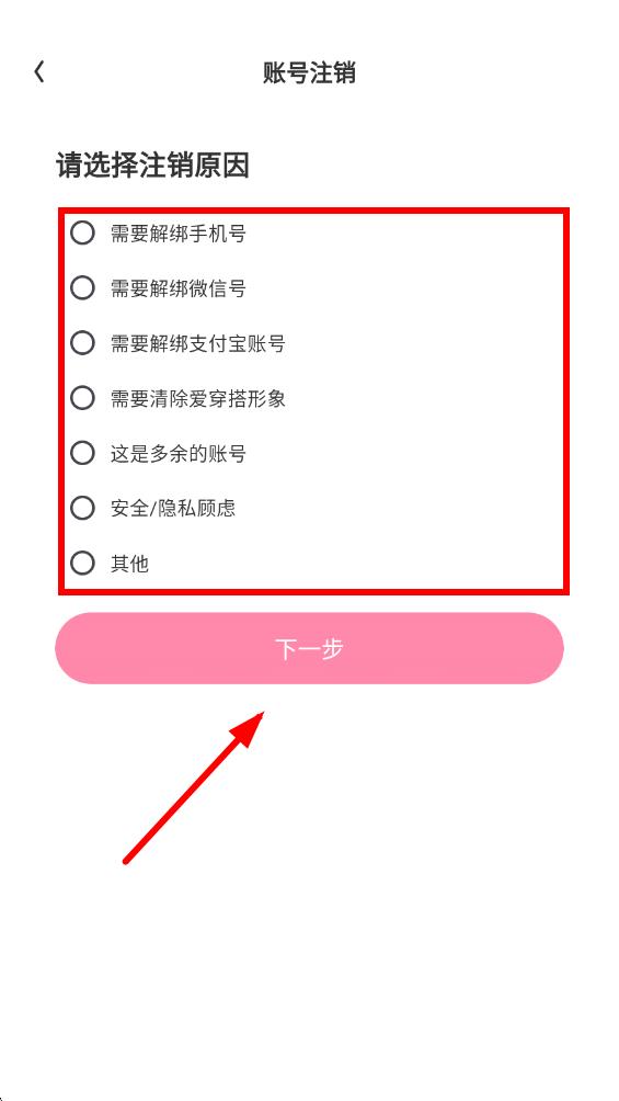 3、在賬號(hào)注銷(xiāo)頁(yè)面中,根據(jù)提示選擇注銷(xiāo)原因,選擇完成后點(diǎn)擊下一步,然后按照后續(xù)提示完成身份驗(yàn)證等操作,即可完成賬號(hào)注銷(xiāo)。