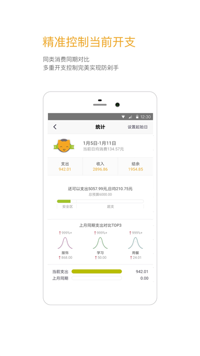 尤其是“非必要支出“,用“!”代表,常駐鍵盤。每筆帳目被記錄時,相當(dāng)于用戶都需要自檢這筆錢花的是否必要。在統(tǒng)計上也給出了清晰突出的表達(dá)。