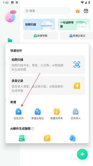 2、在彈出的菜單中,點(diǎn)擊新建區(qū)域里的空白文件選項(xiàng),進(jìn)入思維導(dǎo)圖的編輯界面。
