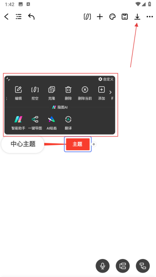 3、在思維導(dǎo)圖編輯界面,可對(duì)主題等內(nèi)容進(jìn)行編輯操作,編輯完成后點(diǎn)擊界面上方的導(dǎo)出箭頭圖標(biāo)。
