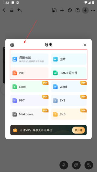 4、點(diǎn)擊導(dǎo)出箭頭圖標(biāo)后,彈出導(dǎo)出選項(xiàng)窗口,可選擇格式來(lái)導(dǎo)出思維導(dǎo)圖。