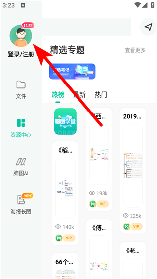 1、打開(kāi)萬(wàn)興腦圖app,進(jìn)入時(shí)點(diǎn)擊左上角登錄/注冊(cè)的按鈕。