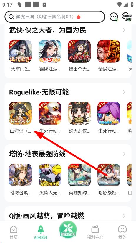 2、在游戲庫中,按分類瀏覽找到感興趣的游戲,比如在Roguelike分類里找到山海記。