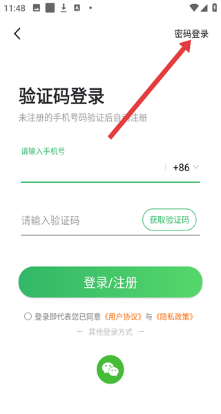 2、進入到驗證碼登錄界面中,可以點擊右上方密碼登錄按鈕,進行切換登錄方式。