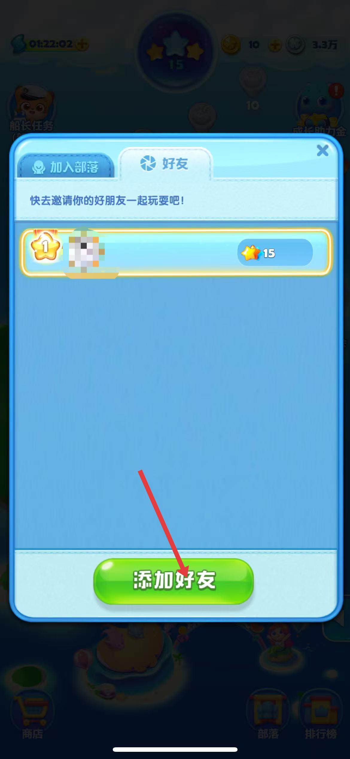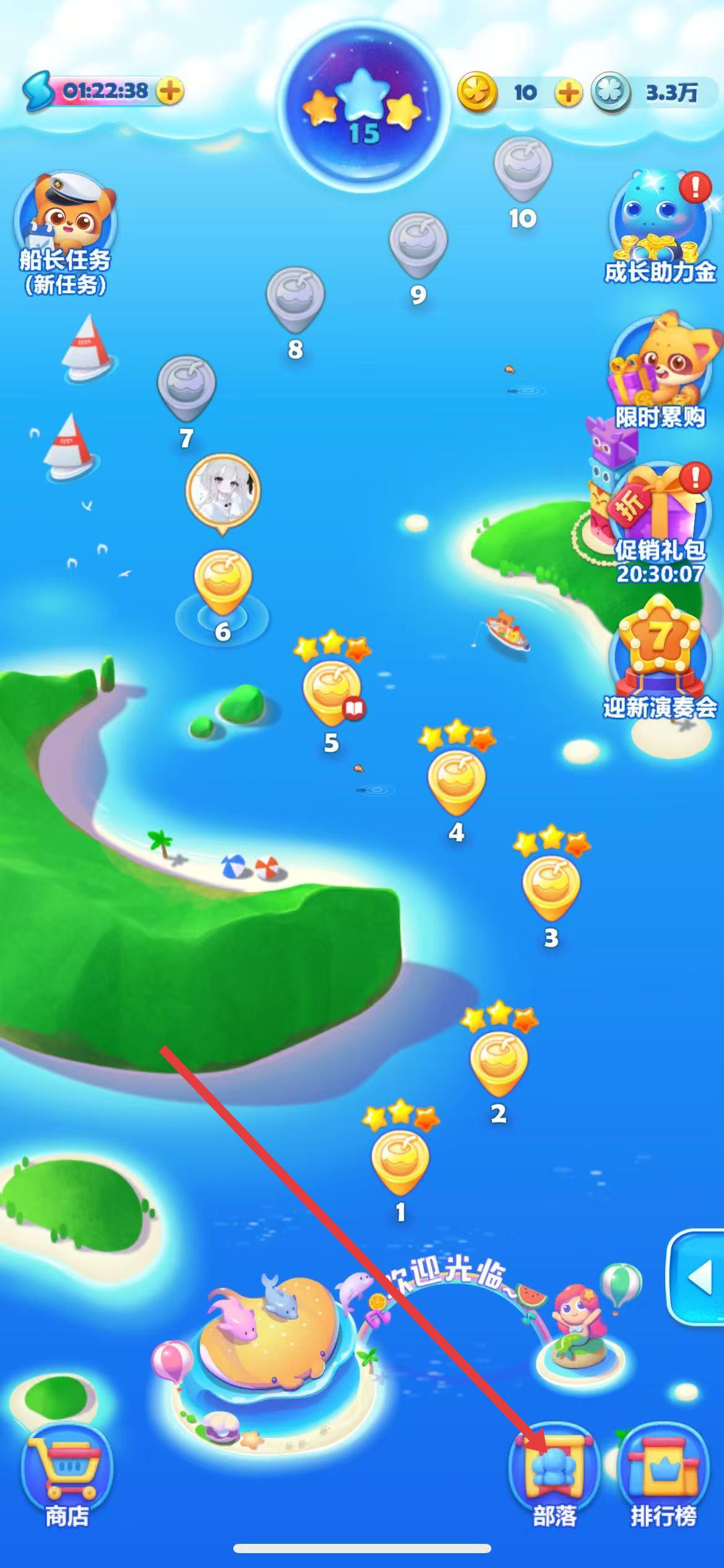 1、打開海濱消消樂游戲,進(jìn)入游戲主界面,點(diǎn)擊主界面下方的部落圖標(biāo)。