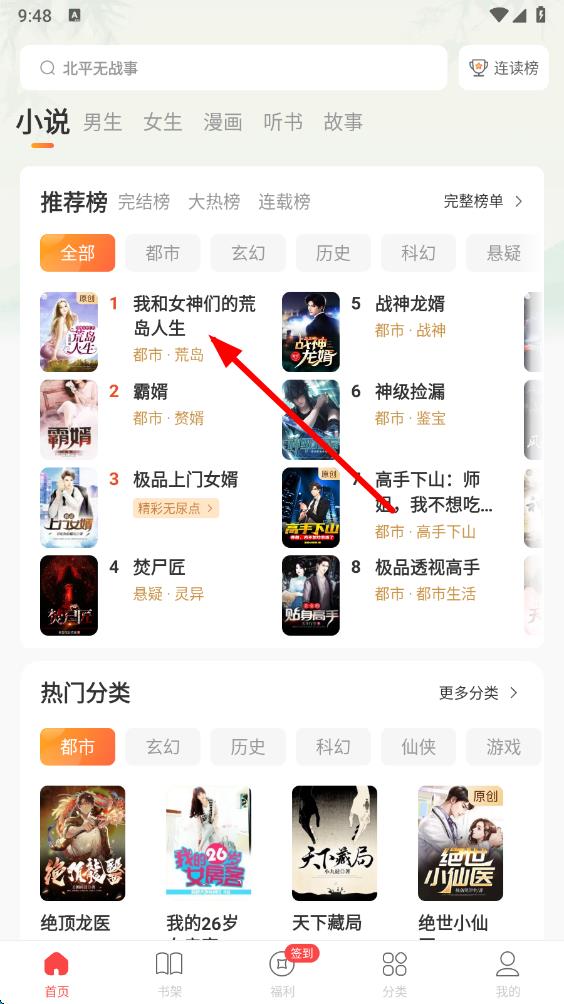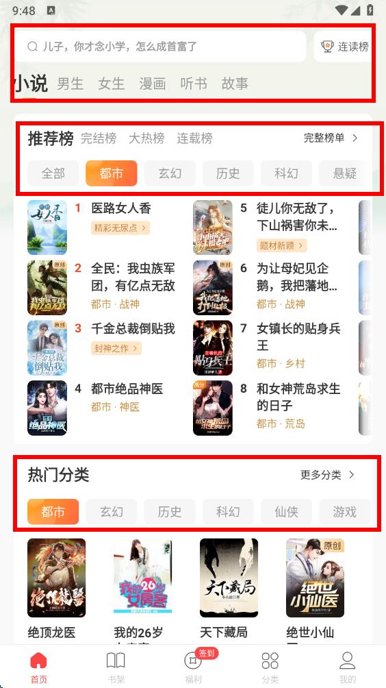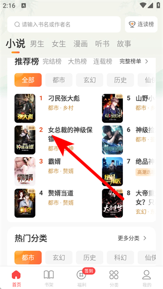 1、打開連尚讀書app進入首頁,首頁設有搜索欄可直接搜索小說,還劃分不同類別,下方是各類小說榜單以及熱門分類。