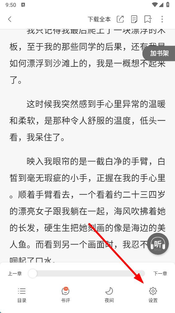 3、在小說閱讀界面中,點擊屏幕中間位置喚出隱藏菜單,點擊底部的設置圖標進入閱讀設置頁面。