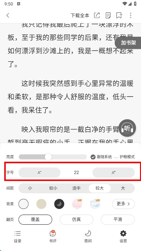 4、在閱讀設置頁面里,找到字號選項,點擊A-可縮小字體,點擊A+可放大字體,按個人閱讀習慣調整到合適的字大小即可。