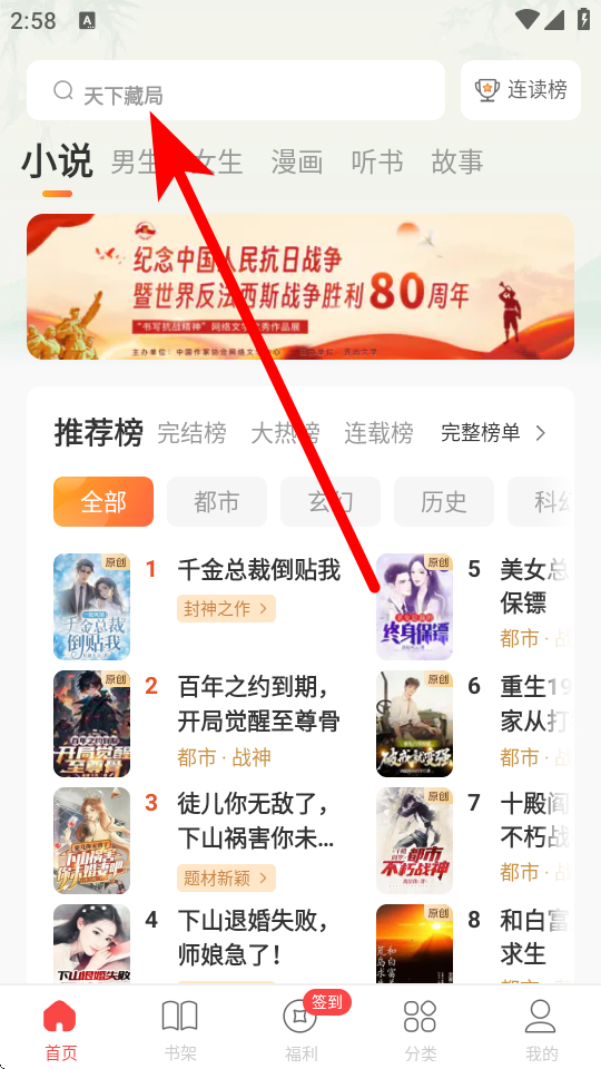 1、在連尚讀書首頁,需要點擊頂部的搜索框。