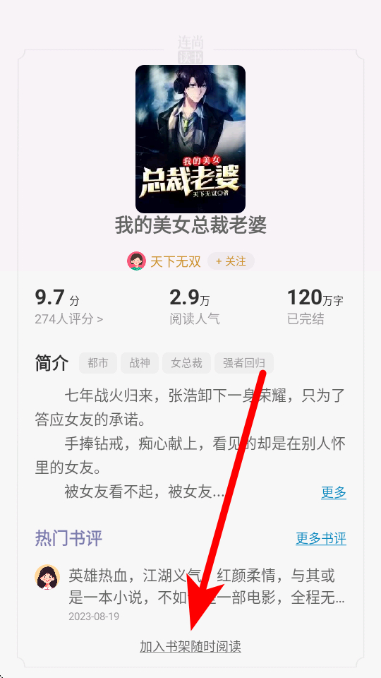 4、在小說詳情頁,點擊加入書架隨時閱讀按鈕,即可將小說加入書架方便后續(xù)閱讀。