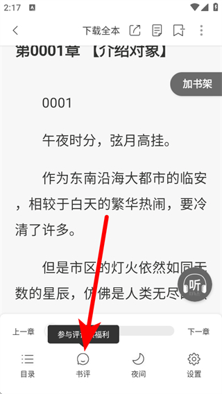 3、在小說閱讀頁面,點擊下方的書評選項。