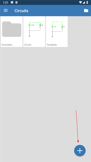 1、打開(kāi)iCircuit應(yīng)用,點(diǎn)擊右下角的藍(lán)色+按鈕,創(chuàng)建一個(gè)新電路。