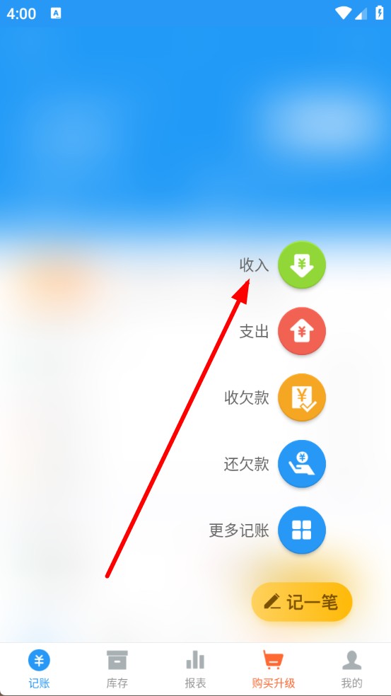 2、在彈出的功能選擇區(qū)域,點(diǎn)擊對(duì)應(yīng)的記賬類型,記錄收入就選擇收入圖標(biāo)。