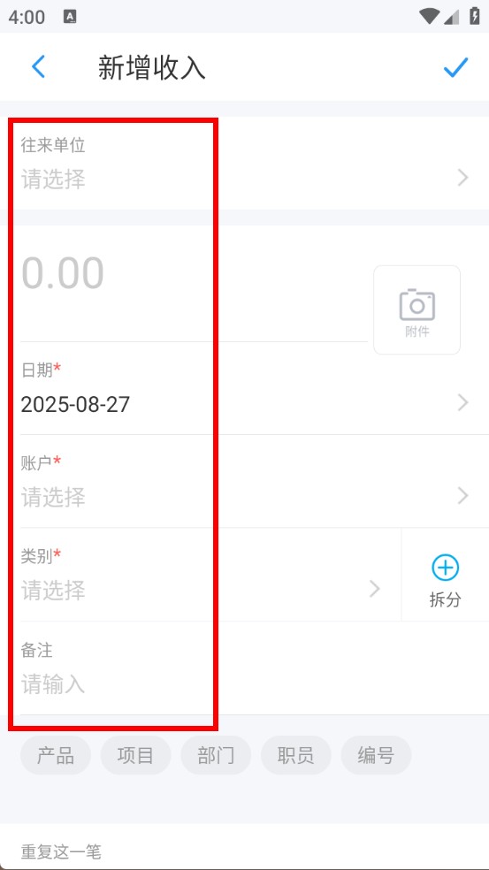3、進(jìn)入新增收入頁(yè)面,填寫往來(lái)單位、交易金額、日期、賬戶、類別等信息。