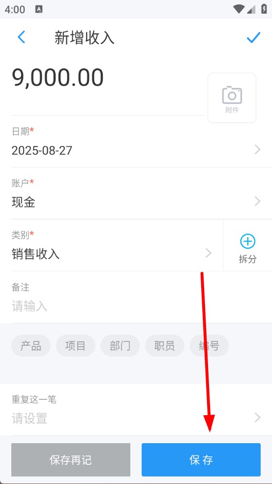 4、確認(rèn)填寫的記賬信息無(wú)誤后,點(diǎn)擊保存按鈕,完成該筆財(cái)務(wù)記錄的登記。