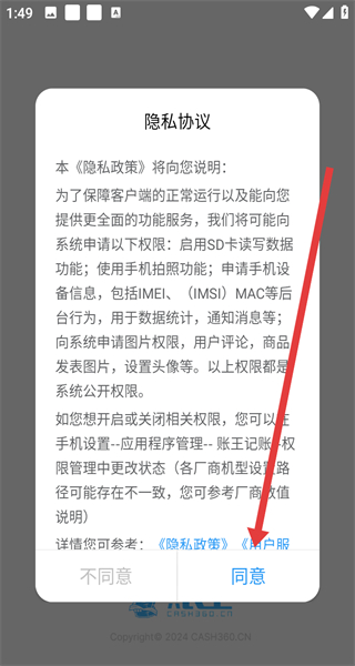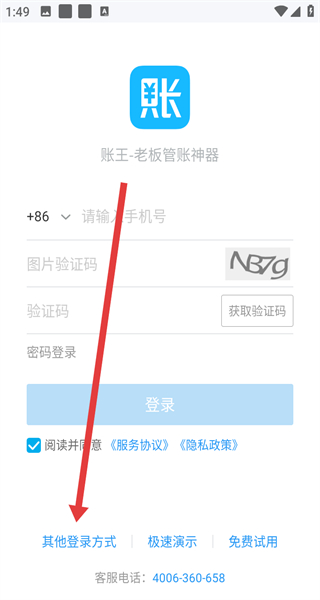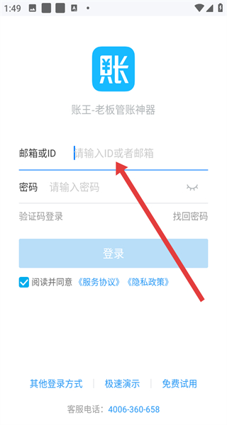 1、打開賬王APP,點(diǎn)擊同意按鈕,確認(rèn)隱私協(xié)議,進(jìn)入登錄界面。