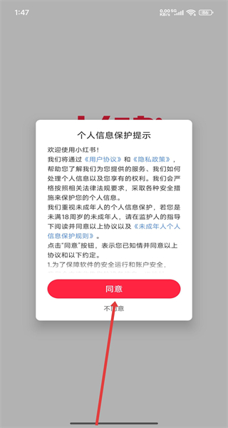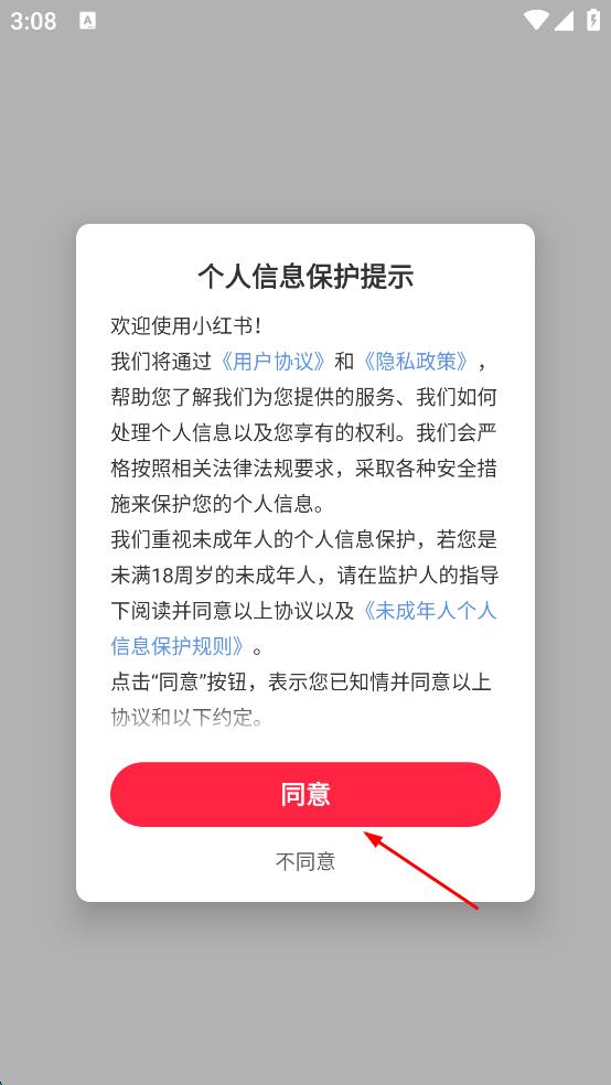 1、打開小紅書APP,彈出個(gè)人信息保護(hù)提示,仔細(xì)閱讀相關(guān)內(nèi)容后,點(diǎn)擊“同意”按鈕,進(jìn)入登錄界面。